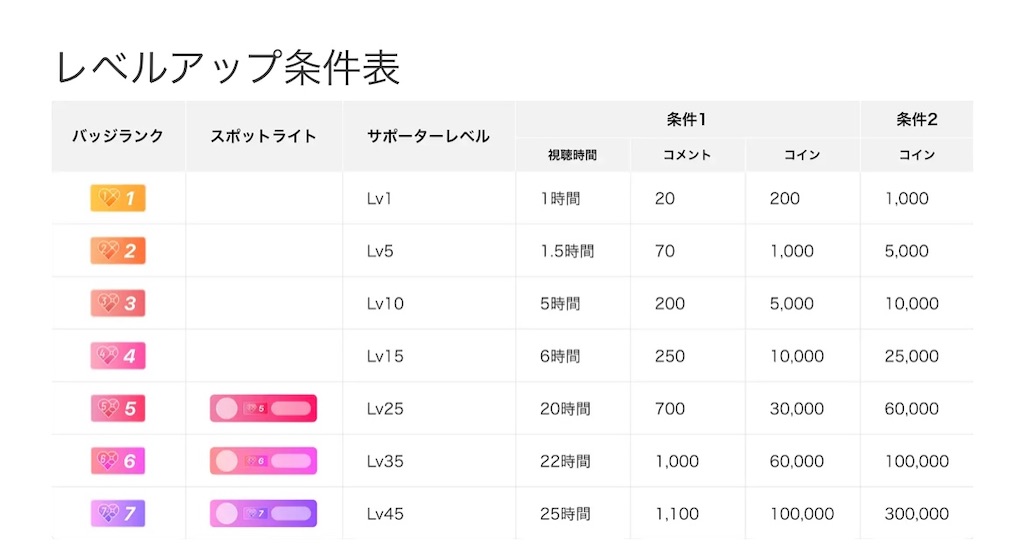 ファンバッジレベル1と2は条件が2つあるけど、3以上は条件が1つとなる
